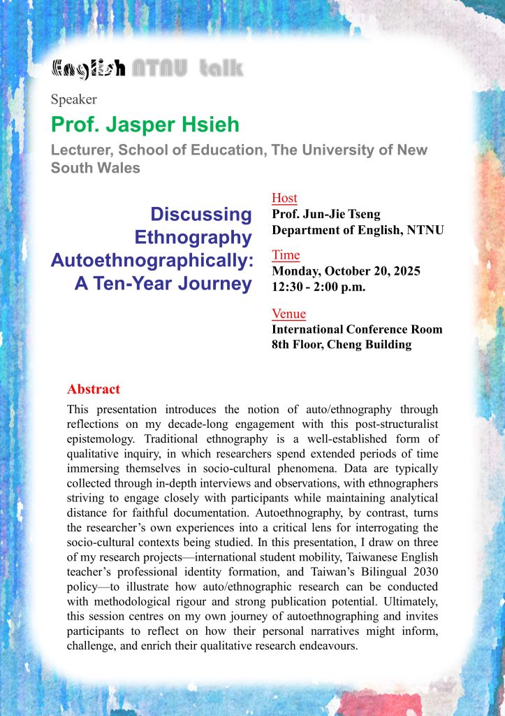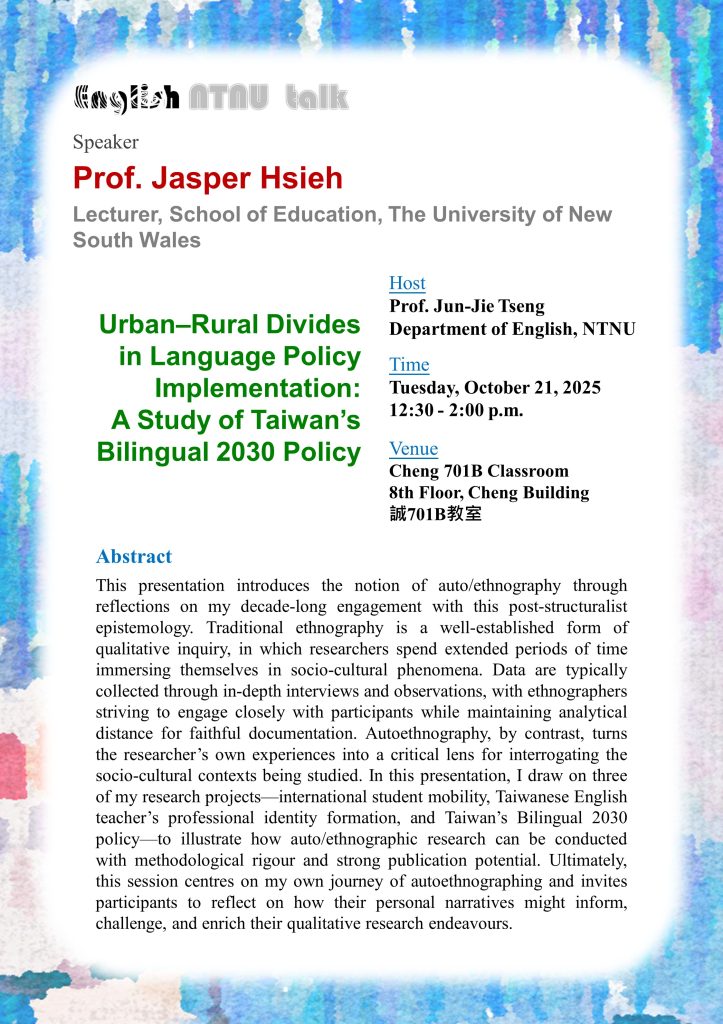 【114-1 TESOL Track】 Lecture: October 20-21, Prof. Jasper Hsieh Post author:江 姿儀 Post published:2025-10-13